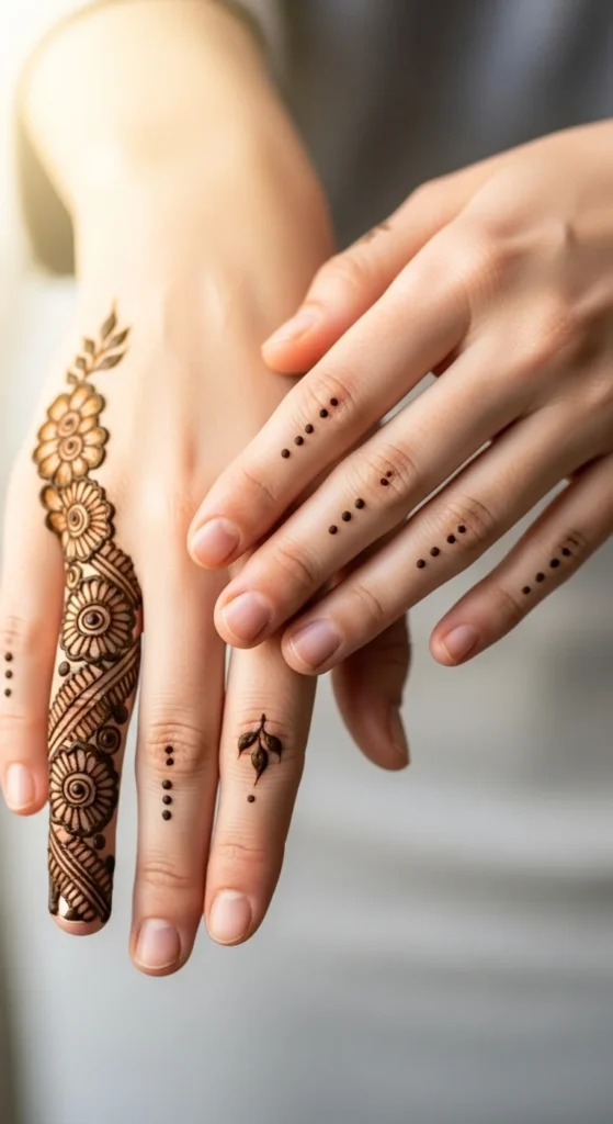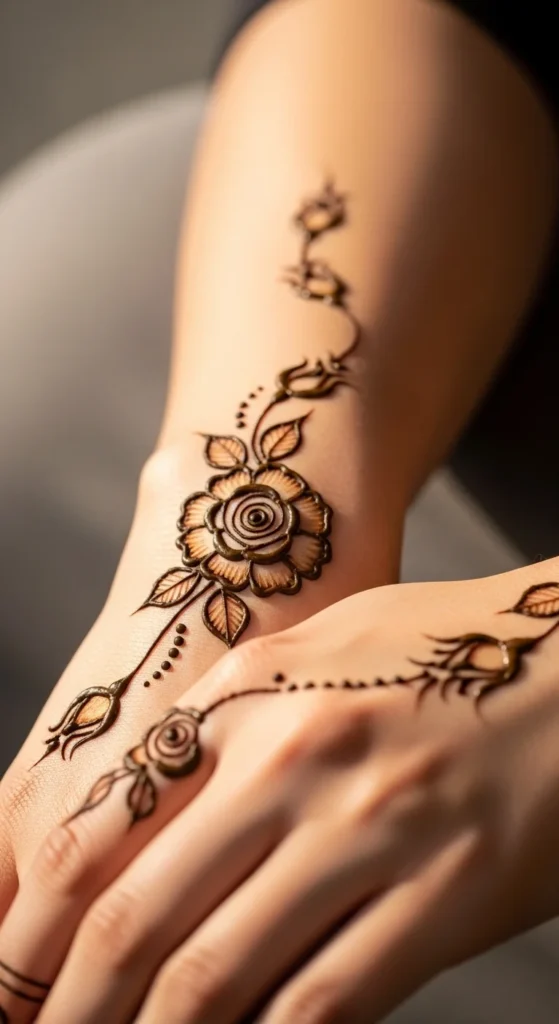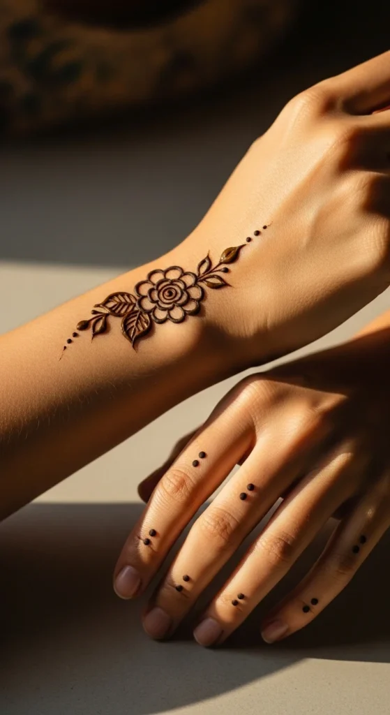 A small wrist rose paired with tiny finger dots is simple but still festive. Place a small rose near the wrist bone with a thin vine and two leaves. On the fingers, add a few tiny dots near the top area, keeping dot placement consistent across fingers. This stands out because it looks clean and balanced. The wrist rose gives a clear focal point, and the finger dots give a finished touch without full coverage. Keep the rose small and avoid adding many layers. The charm is the neat contrast between one floral motif and simple dot details.