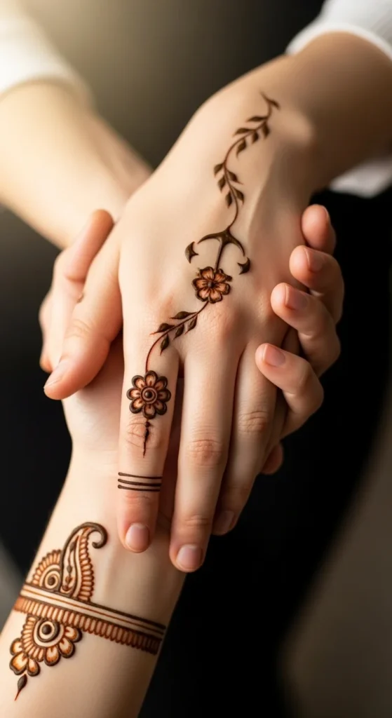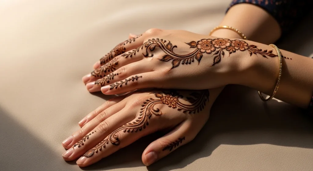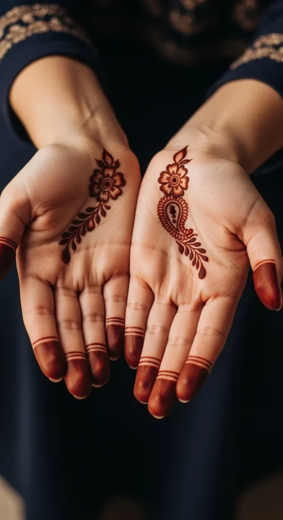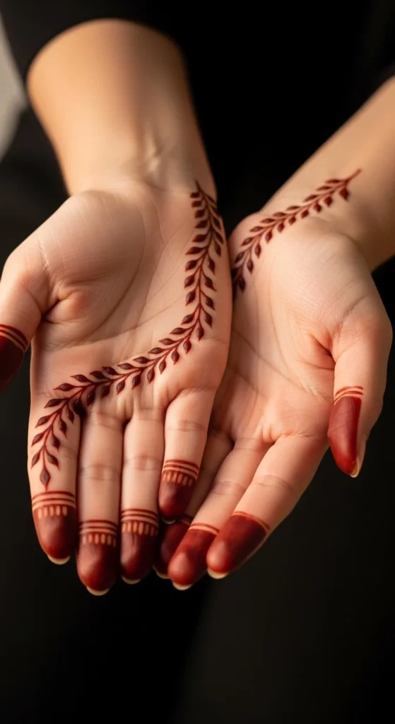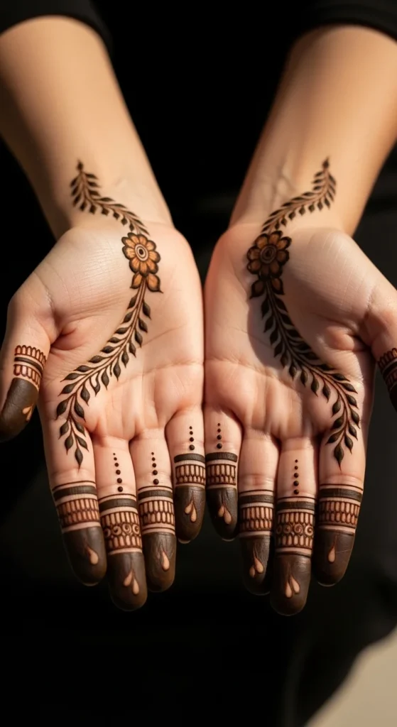 This design stands out because it shows when you move your hand, but stays subtle from the front. Draw a thin vine along the outer edge of the palm from the wrist toward the pinky. Add small leaf sprays that angle inward. Keep the sprays light and spaced so the trail feels airy. This is a popular Arabic placement because it looks stylish in candid photos and doesn’t cover the center palm. The long side trail makes the hand look more graceful, especially when paired with bangles. Keep the vine thin and avoid adding large flowers. The beauty here is the clean line and the open space.
