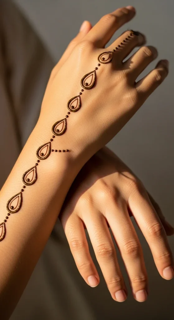 A drop chain design creates a clear line from wrist to finger, like jewelry. Start with a small teardrop near the wrist. Add two more teardrops moving upward toward the middle finger. Connect them with dotted links. On the middle finger, add a small ring band detail near the base. This stands out because the chain line is clean and easy to see. Keep the teardrops small and consistent. Leave the rest of the hand open so the chain stays the main focus. This is a great option for photos because the vertical flow looks elegant and structured.