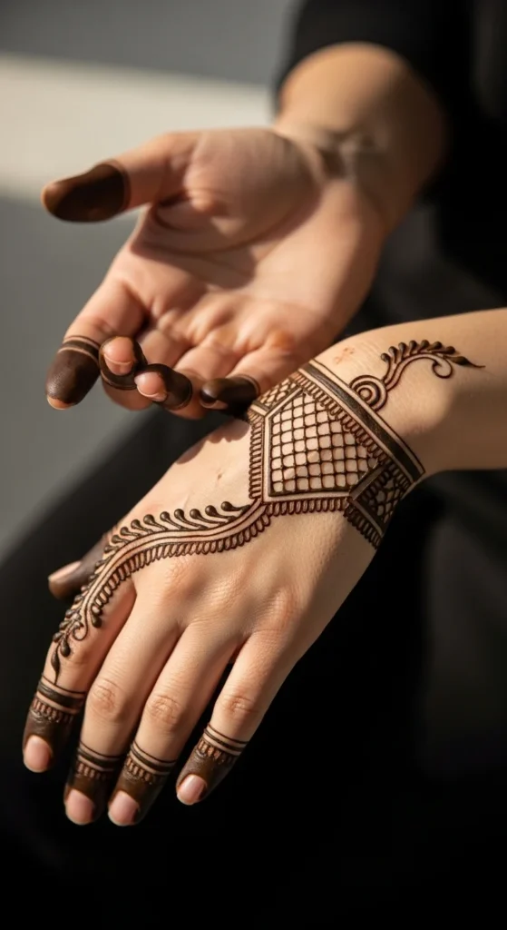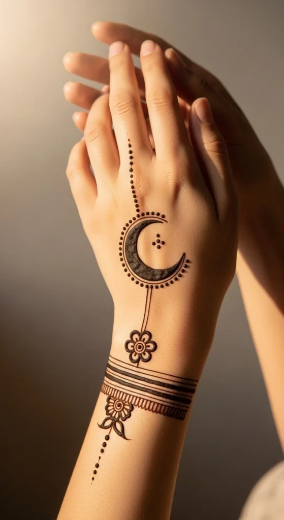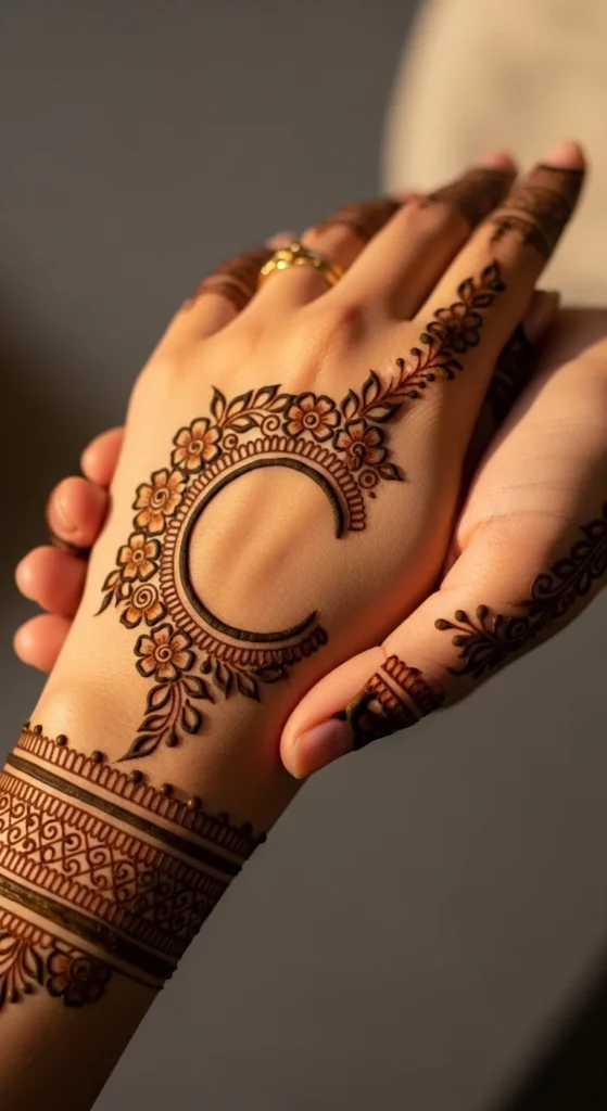 A crescent motif with a small floral accent gives a modern Arabic feel. Place a thin crescent near the center of the back of the hand, then tuck a small flower at one end of the crescent. Add a tiny vine that trails slightly upward. Keep everything thin and clean. This design stands out because the crescent is a bold shape even when it’s minimal. The small flower softens it without making it busy. Leave the fingers mostly bare to keep the look modern. A few dots near the crescent can add a finished look, but keep them minimal so the crescent remains the focal point.