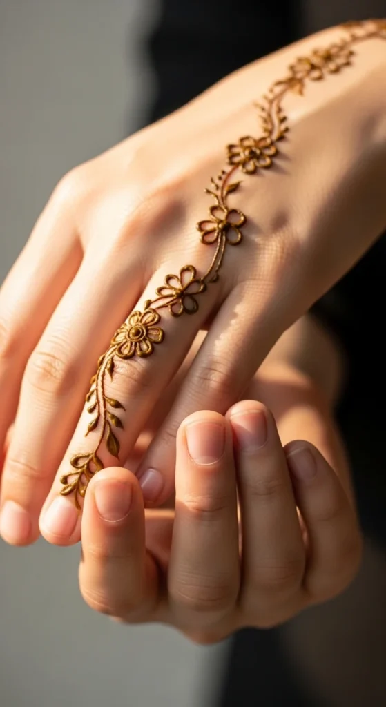 This design uses a curved vine shaped like a “C” to create a stylish frame with an open center. Start near the wrist side and curve the vine upward toward the knuckle area. Place small flowers along the curve and add leaves on the outer edge. Keep the inner side clean so the open center stays clear. This stands out because it looks like a shaped composition, not scattered motifs. The curve adds movement, and the open center keeps it modern. Keep the flowers small and consistent. Avoid heavy shading so the curve stays light and elegant.