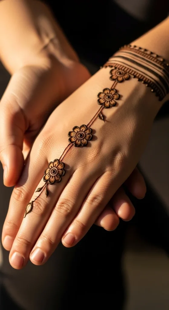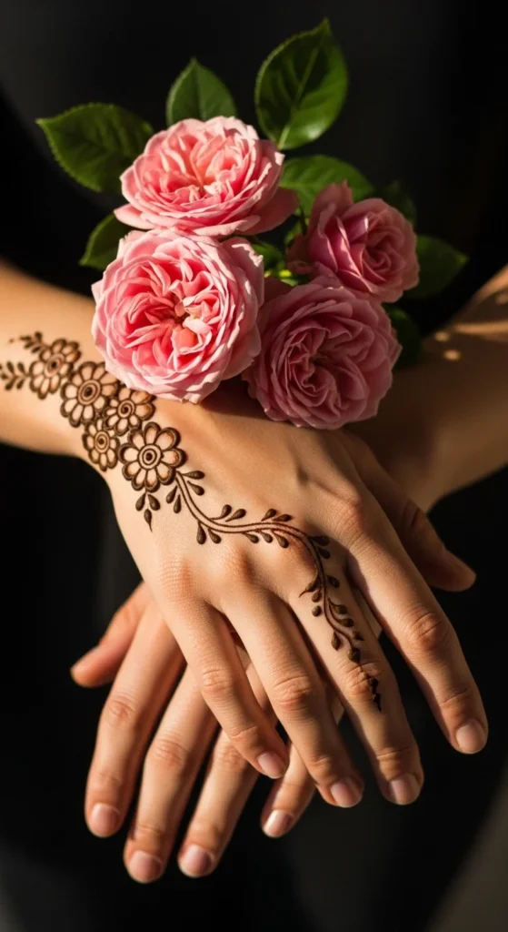 A three-flower chain across the back of the hand is simple, balanced, and always noticeable. Place three small flowers in a gentle curve near the knuckles, running from the index side toward the pinky side. Connect them with thin vines. Add small leaves between flowers, keeping leaf sizes consistent. This design works well because it follows the hand’s natural line and frames the fingers without covering them. It also gives a soft, feminine look while staying easy. Keep the flowers similar in size so the chain looks neat. If you want a clean Arabic touch, add tiny dot clusters around the ends of the chain, but keep the center open and uncluttered.