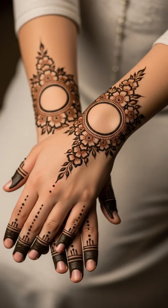 A floral cuff wraps around the wrist area like a wide bracelet, but the center stays open so it doesn’t feel heavy. Create a row of small flowers around the wrist with thin connecting vines. Keep petals rounded and consistent. Add a few leaves between flowers, but don’t crowd the pattern. This stands out because it frames the wrist like jewelry and looks finished even if the rest of the hand is bare. The open center space keeps the design looking clean. If you want it to feel more Arabic, add a small paisley or teardrop motif on the top side of the cuff only. Keep everything thin so the cuff looks neat in photos and doesn’t turn into a dark band.