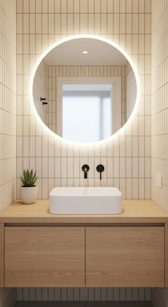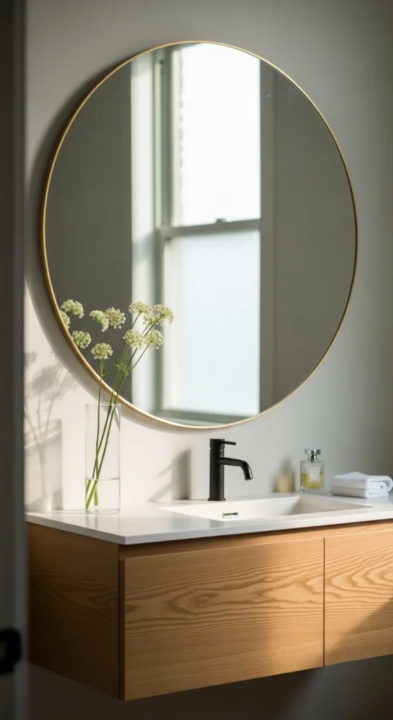 A bigger mirror reflects more light and makes the bathroom feel wider. Choose a thin frame or frameless edge so the mirror looks airy rather than heavy. Backlit mirrors add a soft glow that feels high-end without extra decor. If you’re styling a small vanity, a mirror that’s wider than the sink visually stretches the wall.