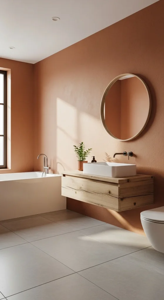 Earthy colors bring warmth to bathrooms that feel cold or too stark. Try clay, sand, warm beige, or soft terracotta for a calm, grounded look. Paint is a low-cost update that changes the mood instantly, especially in a powder room. Keep trims and fixtures white so the color looks clean, and add natural textures like wood or linen to match.
