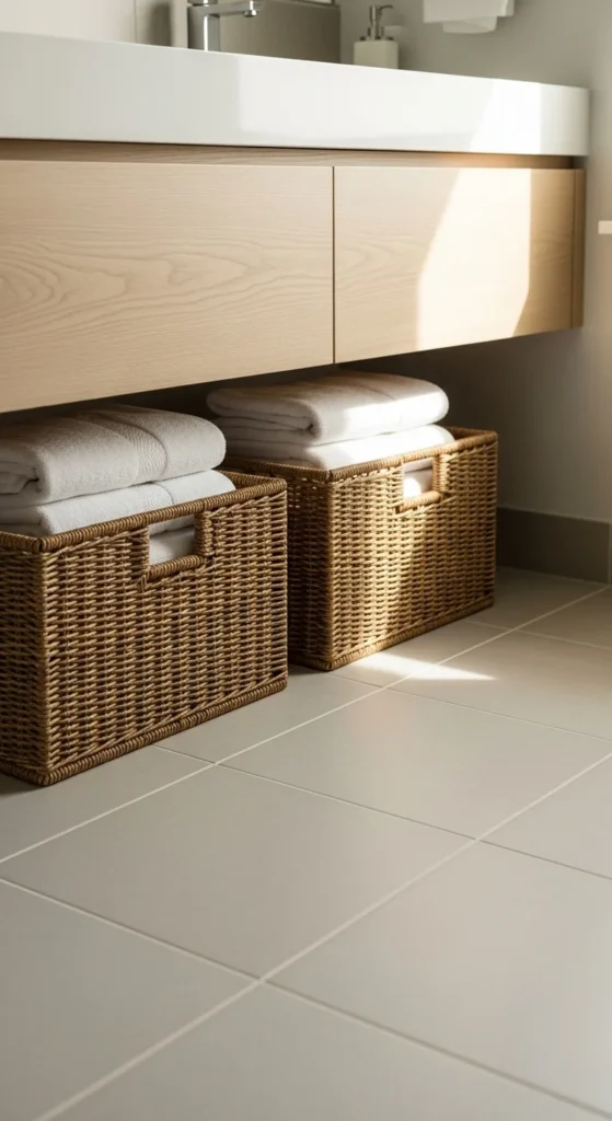 Wicker baskets hide clutter while adding texture that makes the room feel lived-in and warm. Use them under the sink, on open shelves, or beside the tub for extra towels. Pick lined baskets or ones with a sealed finish so they hold up better in humidity. For a budget DIY, add simple labels inside the basket rather than on the front to keep the look clean.