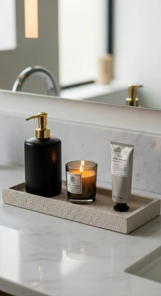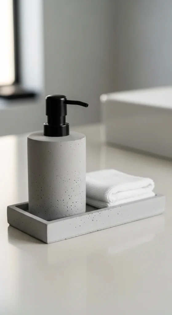 Stone and concrete accessories add weight and calm to a bathroom’s styling. Start with a soap dispenser, toothbrush cup, or tray to keep the look simple. These materials pair well with warm wood, white tile, and black fixtures. Keep surfaces uncluttered so the accessories stand out, and store extras inside drawers or baskets for a tidy finish.