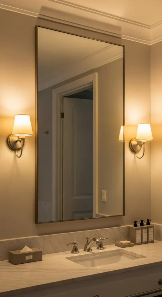Lighting changes everything, especially in bathrooms where shadows can feel harsh. Wall sconces on both sides of the mirror create even light for skincare and grooming. If hardwiring isn’t possible, use plug-in sconces and hide cords with paintable covers. Pair them with warm bulbs to make the room feel relaxed at night while still bright enough in the morning.
