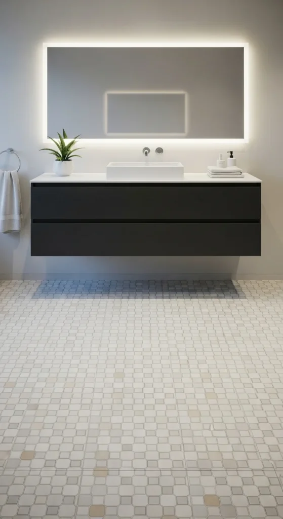 Geometric floors add interest without filling the walls with decor. Small patterns work well in compact bathrooms because they add detail without feeling busy. Keep wall colors and towels simple so the floor becomes the hero. If replacing tile is out of budget, use high-quality peel-and-stick floor tiles and seal edges well for a longer-lasting finish.
