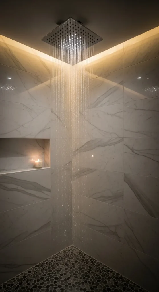 A rain-style shower head makes the bathroom feel more spa-like with one swap. Many models screw onto existing plumbing, so the install is usually simple. Choose a water-efficient version and clean the nozzles regularly to prevent mineral buildup. Pair it with a clean shower shelf and a neutral curtain or glass panel to keep the look streamlined.