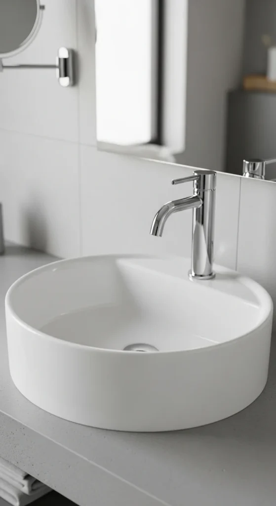 Curved shapes soften bathrooms filled with straight tile lines and sharp corners. A rounded basin, arched faucet, or curved mirror adds a gentle contrast. You don’t need to change everything—one curved feature is enough to shift the look. This works especially well with neutral palettes and warm metals for a softer modern style.