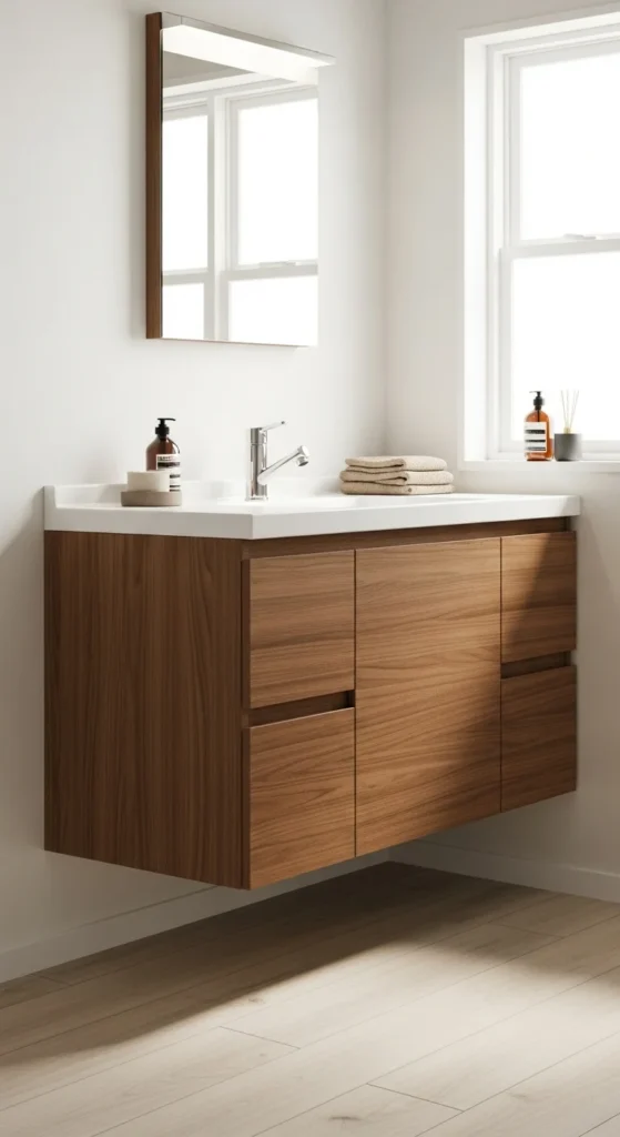 A floating vanity shows more floor, which makes the room look less packed. It also makes cleaning easier since you can sweep and mop under it quickly. Choose a simple design with drawers so storage stays hidden. If you can’t replace the vanity, raising it on slim legs or removing a bulky base trim can mimic the look.