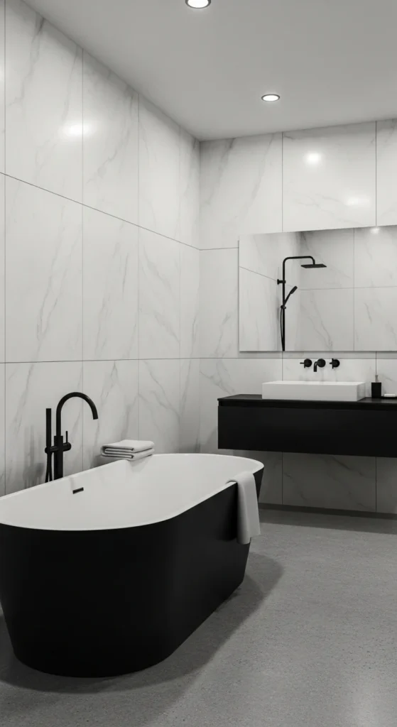Monochrome looks clean because everything feels connected. Keep the main surfaces in one palette and use texture to add depth, like matte tile, glossy accents, and soft towels. Black and white works in small bathrooms when you balance dark elements with plenty of light. A simple way to start is matching towels, rugs, and accessories in one tone while keeping walls light.