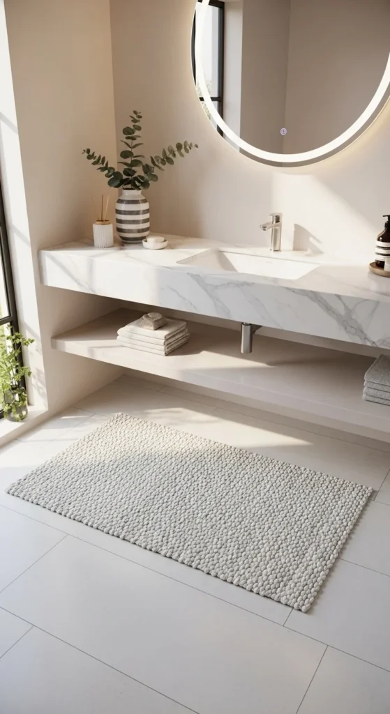 Rugs warm up tile floors and make the bathroom feel more comfortable. Choose washable rugs so cleanup stays easy, especially near sinks. Texture matters more than pattern—woven, tufted, or ribbed styles add depth. For small bathrooms, a runner can make the room feel longer, while a compact mat works well in front of a vanity.