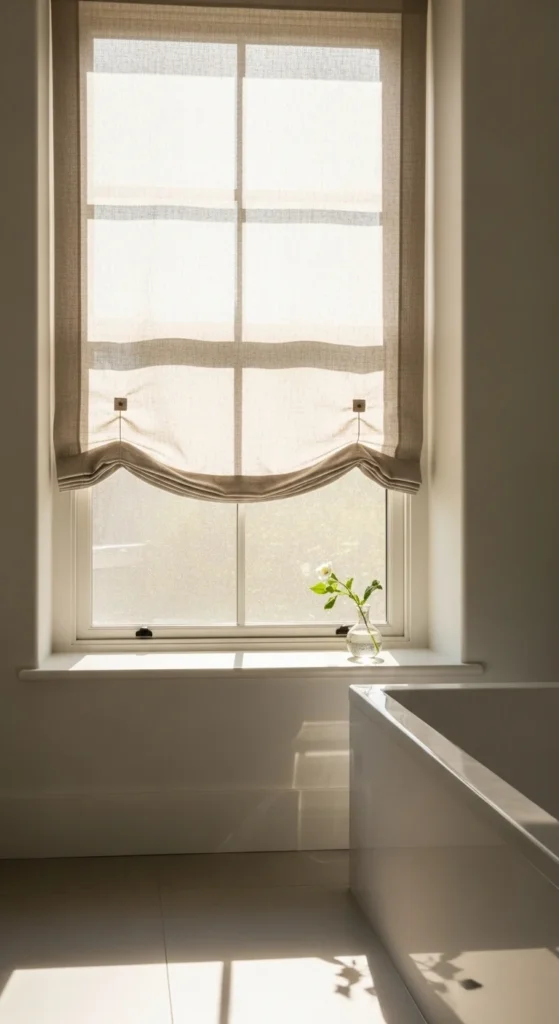 Soft curtains add privacy while still letting daylight through. Choose sheer linen or cotton blends so the window stays bright. Keep the rod simple and place it slightly higher than the frame for a taller look. If you prefer blinds, use light-toned woven shades to add texture without blocking too much light.