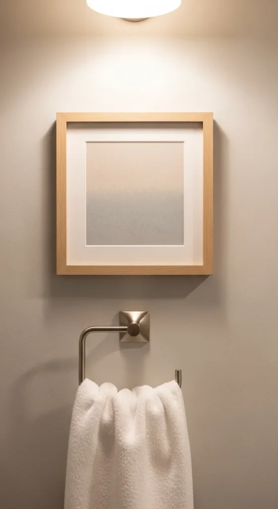 Wall art adds personality when it stays simple and well-placed. Choose moisture-safe frames and avoid paper prints that can warp. One small piece above the toilet or beside the mirror can be enough. If you want a DIY option, frame a textured fabric swatch or a simple photo print in neutral tones to match the room.