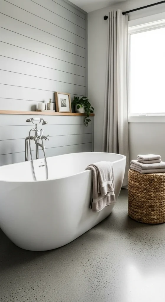 Wall cladding adds texture that paint alone can’t match, especially in simple bathrooms. Use it on one wall so it feels intentional rather than busy. Choose moisture-resistant panels or seal the surface well if it’s real wood. Paint it a soft neutral and pair it with warm metals or wood accents to keep the look cozy.
