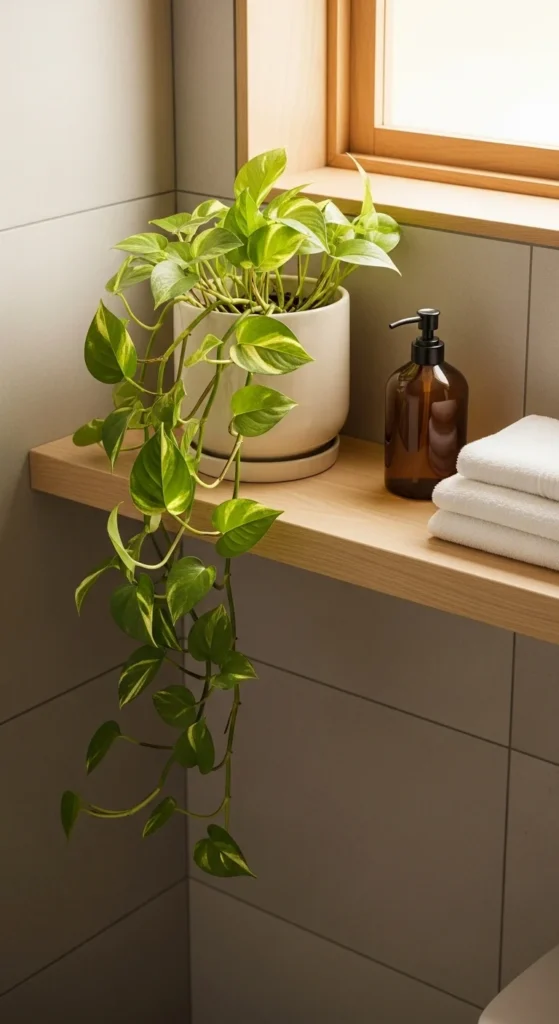 Plants add life and soften the hard lines of tile, glass, and stone. Pick easy options that handle humidity such as pothos, snake plant, or fern. Use a small pot on the vanity, or place a plant on a high shelf to save counter space. If the room has low light, use a realistic faux plant with matte leaves for the same calm vibe.