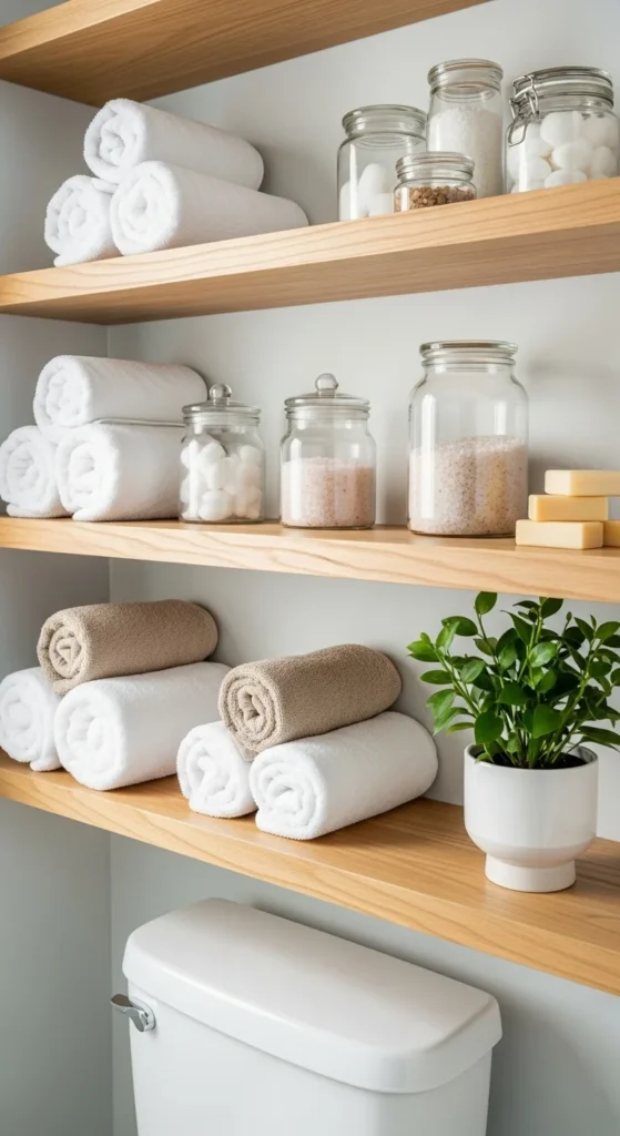 Open shelving gives you extra storage while also serving as decor. Keep it tidy by using baskets for small items and jars for cotton pads and swabs. Limit what you display so it doesn’t look crowded, and repeat colors for a clean look. A simple DIY shelf using brackets and a wood board can cost far less than a cabinet.