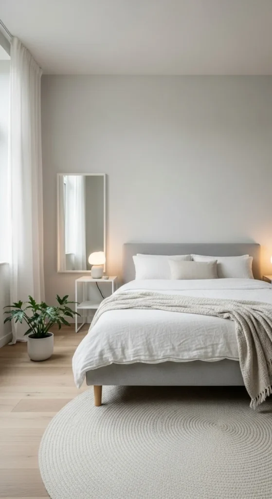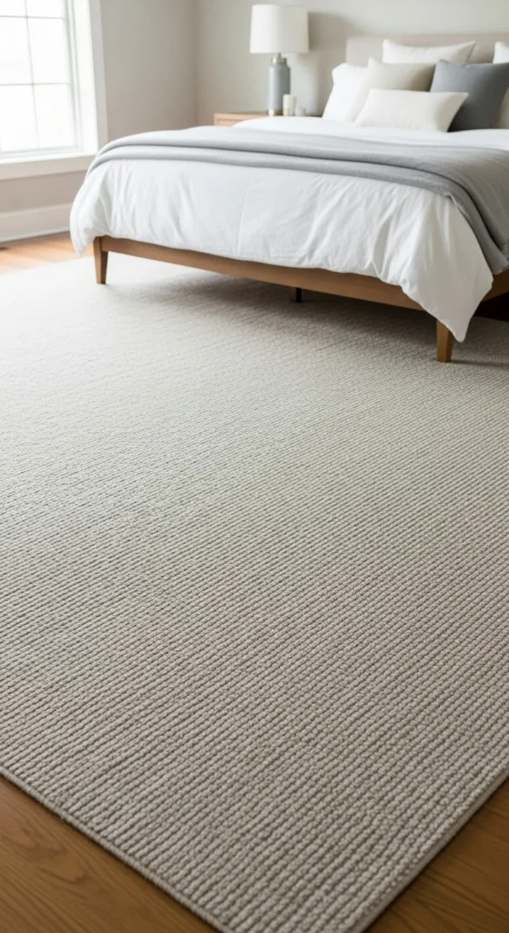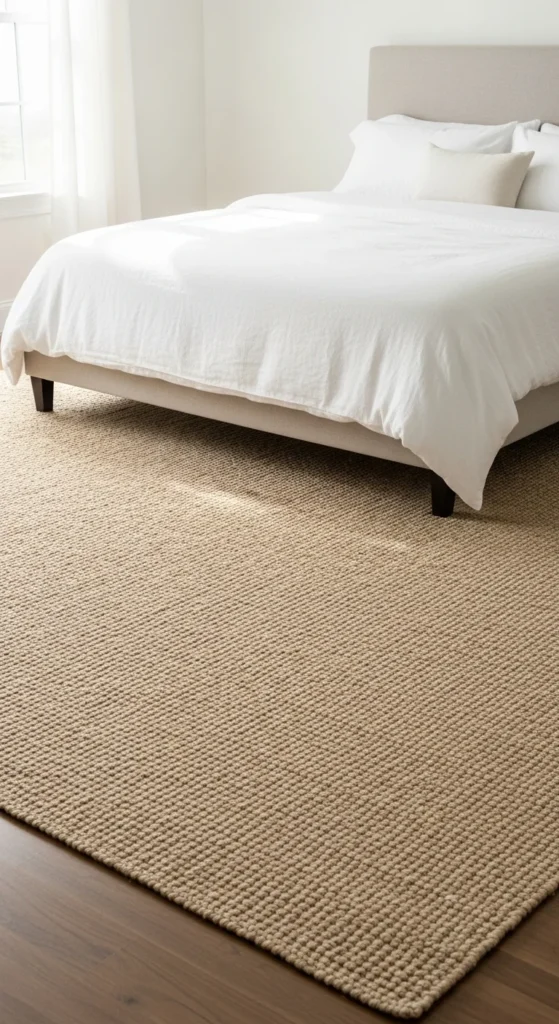 Rugs add warmth and define the sleeping area. Choose a rug large enough to extend beyond the bed on all sides. Neutral tones keep the look cohesive. Layering a smaller rug on top adds softness. This works especially well in larger rooms.