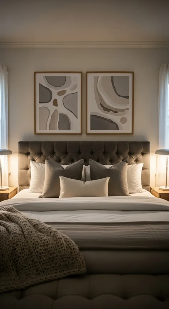 Symmetry brings visual order, which helps a bedroom feel settled and composed. Two matching art pieces above the bed create balance without adding clutter. Abstract designs work best because they don’t pull attention too strongly. Keep colors muted so the art supports rest rather than stimulation. Frames should be simple and similar in size to maintain harmony. For a budget approach, download printable art and frame it in identical frames. Thrift stores are also great sources for matching artwork sets. Hang the pieces at eye level when seated on the bed, not standing. This placement feels more natural in a sleeping space. Symmetry like this makes the bed feel anchored and intentional, giving the room a finished look with very little effort.
