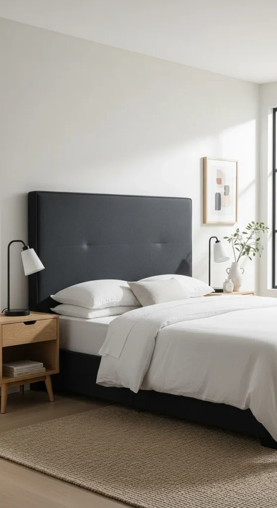 A strong headboard can carry the entire bedroom design. Upholstered or padded styles add softness and visual weight in the right place. Choose a deeper tone such as charcoal, olive, or warm brown to ground the bed. Keep bedding and walls simple so the headboard stands out naturally. If replacing furniture isn’t possible, attach a DIY upholstered panel behind the bed using plywood, foam, and fabric. Wall-mounted panels also save space. When the headboard does most of the visual work, the rest of the room can stay calm and uncluttered.