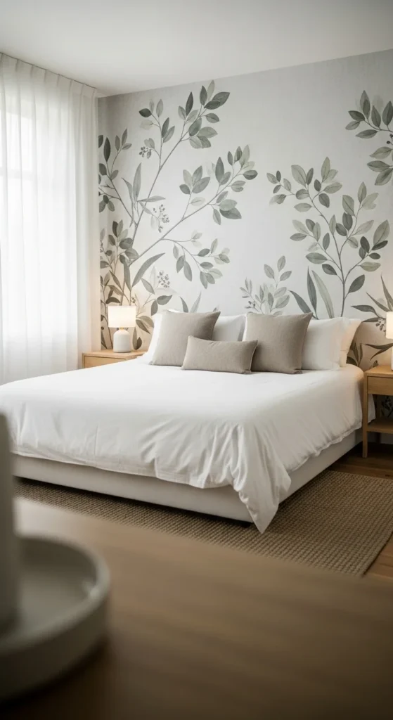 Murals bring nature indoors without adding objects. Soft floral or leafy designs feel calming when colors stay muted. Use murals on the wall behind the bed to create focus without surrounding clutter. Peel-and-stick options make this renter-friendly and affordable. Balance the mural with simple bedding and minimal furniture. Avoid busy patterns or high contrast. One large natural image often feels quieter than multiple framed pieces. This approach adds personality while keeping the room restful.