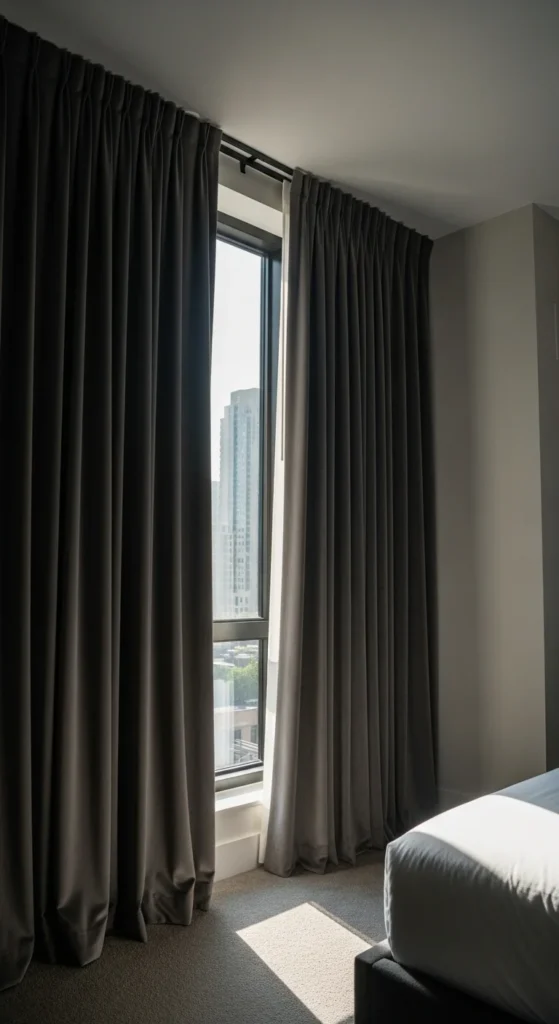 Tall curtains change how a room feels by drawing the eye upward. Hanging rods near the ceiling makes walls feel taller. Choose soft fabrics that fall straight. Neutral tones keep the look calm. Curtains don’t have to block light fully to work. Even sheer panels add softness and structure. Curtain panels are widely available and easy to install, making this a high-impact update.