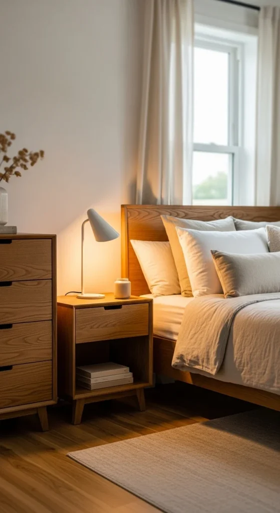 Darker nightstands ground lighter beds and walls. They add contrast without overwhelming the space. Look for simple shapes with minimal hardware. Thrifted pieces can be sanded and stained for a custom look. Keeping surfaces mostly clear maintains balance.