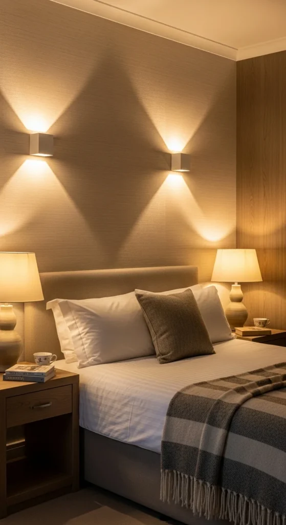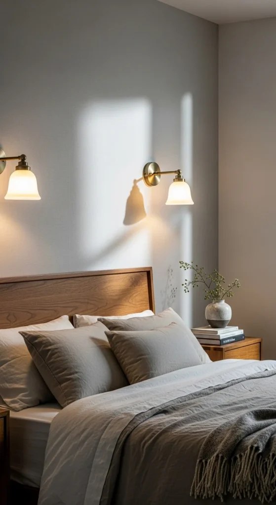 Wall sconces free up nightstand space and introduce soft, directional light. This creates a cleaner bedside setup. Plug-in sconces work well when wiring is limited. Choose simple shapes and warm bulbs for comfort. This small change makes the room feel more intentional and less cluttered.