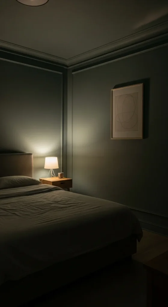 Darker paint feels soothing when paired with gentle lighting. Table lamps, sconces, and floor lamps create layers. Avoid bright overhead light at night. Warm bulbs soften shadows. This combination supports rest.