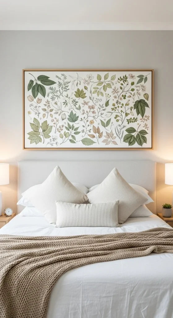 Nature-inspired art brings calm without visual noise. Choose organic shapes or muted plant motifs. One or two pieces are enough. Avoid busy frames or bright colors. This keeps the focus on rest rather than stimulation.