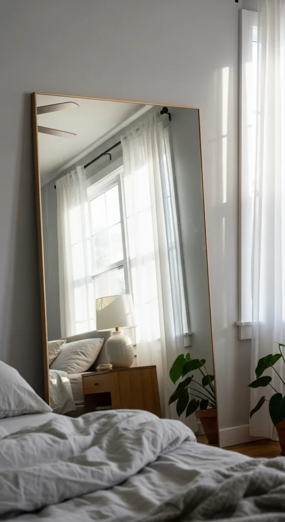 Mirrors placed opposite windows bounce light around the room. This helps darker bedrooms feel brighter and more open. Simple frames work best. Thrifted mirrors can be painted to match the room. Light reflection supports a relaxed atmosphere.