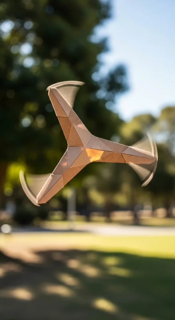 Smaller boomerangs spin faster and travel in tighter circles. Folding a compact shape with thick layers keeps it sturdy. Because of its size, it responds strongly to wrist flicks. Gentle throws create smooth loops close to you. This makes it good for smaller spaces. The quick spin also keeps it stable during flight. Adjusting the arm bends changes how high it climbs. This design is fun for quick practice sessions. It shows how spin speed affects performance.