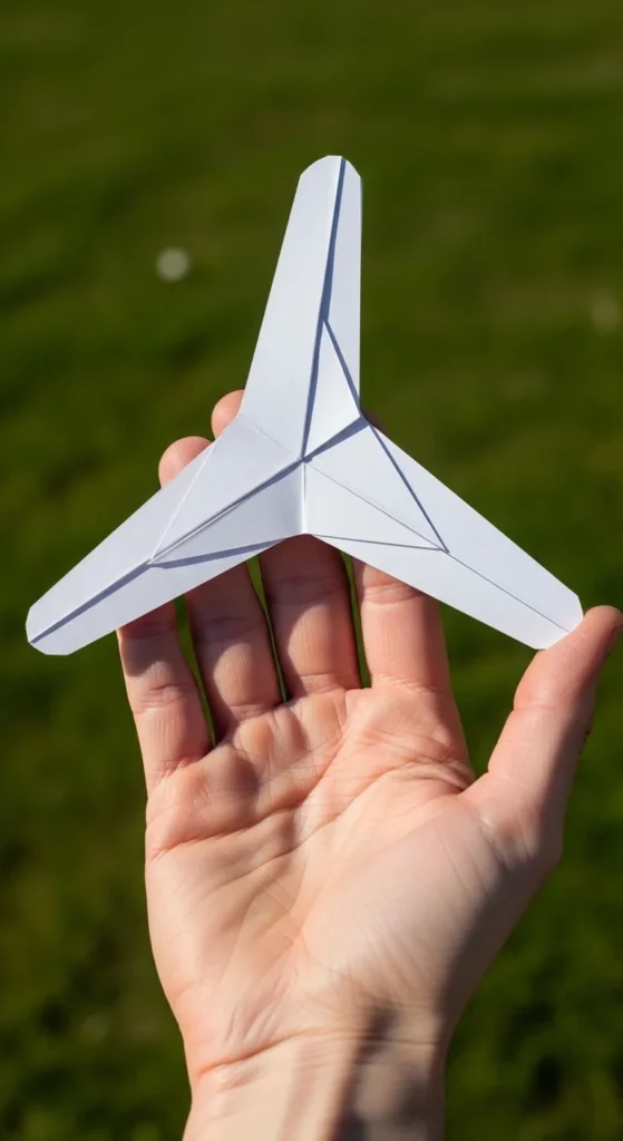 This version uses lighter paper and softer curves so it flies shorter distances. The goal is safe indoor or small-yard play. Keep the arms rounded with no sharp points. Adding only a small upward bend keeps the flight slow and controlled. This design responds best to a gentle toss rather than a strong throw. Because it’s lighter, it won’t travel far even with good spin. Kids can learn basic throwing technique without worrying about distance. It may not return perfectly every time, but it still curves enough to be fun. Using colored paper before folding adds visual excitement. This style focuses on ease and safety over performance.