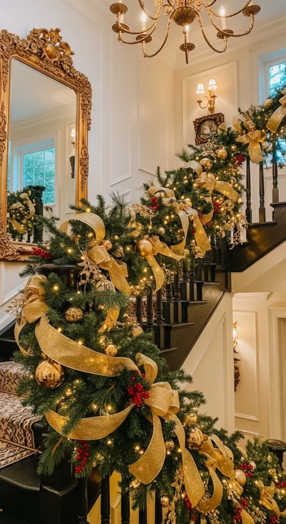 Drape faux garland along your stairs. Weave in ribbon and lights. It’s an effortless way to add Christmas charm to your home.