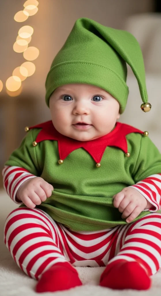 A baby elf outfit suits indoor photos and family gatherings. Parents can use soft leggings, a green onesie, and felt accessories. Keep everything gentle on the skin. Add a soft red belt with Velcro. Kids love the bright colors. For shoes, use fuzzy green socks. Try a simple pointed hat made from felt. Glue is fine but stitch edges if possible. Look for gentle fabrics. Add small jingle bells, but keep them sewn tight for safety. Use a simple candy cane prop to complete the look.