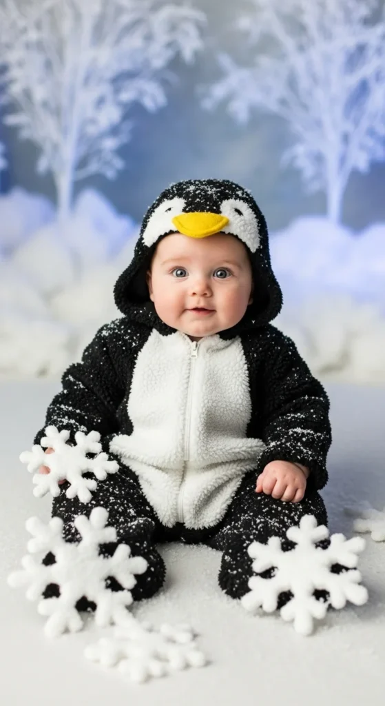 A baby penguin costume is cozy. Use a black onesie with a white patch. Add a felt beak headband. Keep it small. Add yellow socks for feet. Parents can use a faux snow blanket. Keep everything soft. For budget ideas, skip the beak and draw tiny freckles. Warm layers help in cooler rooms.