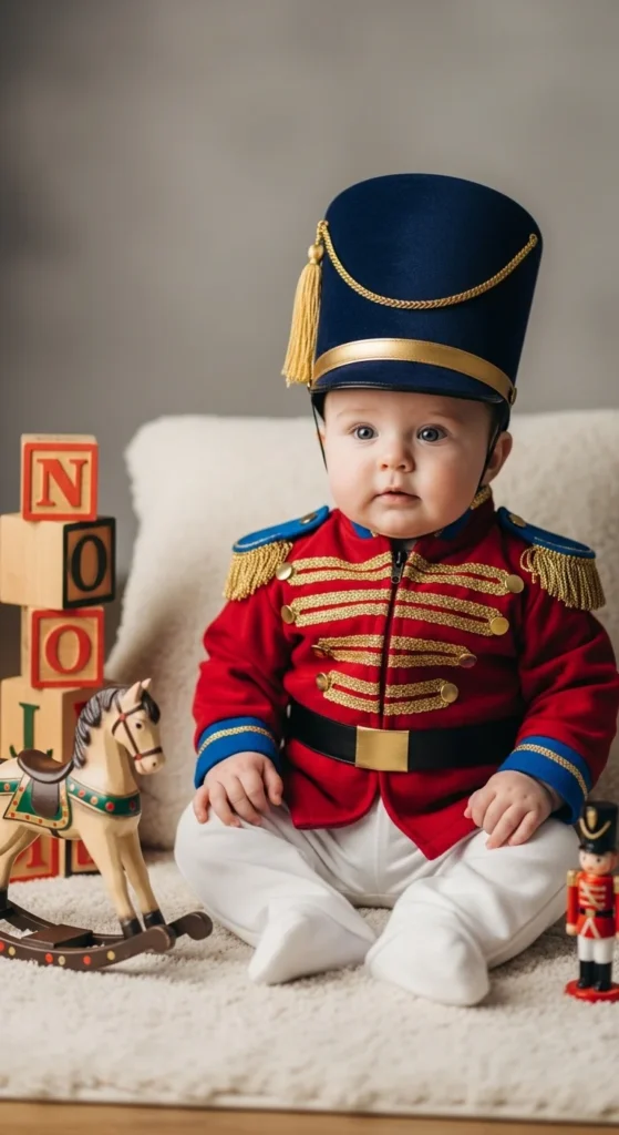 A baby nutcracker theme feels theatrical. Use red and gold touches on a onesie. Add felt shoulder pads. Skip small beads. Add a soft foam hat. Parents can set wooden toy props. For budget ideas, use gold ribbon scraps. Bold lines help define the look.