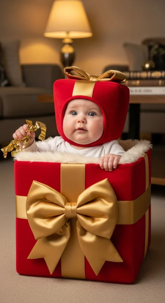 A baby gift box costume draws laughs. Use a soft fabric box shape. Attach a ribbon bow. Keep armholes roomy. Avoid heavy cardboard. Add matching socks. Parents can photograph near real gifts. For budget help, repurpose older fabric. Big bows highlight the theme.