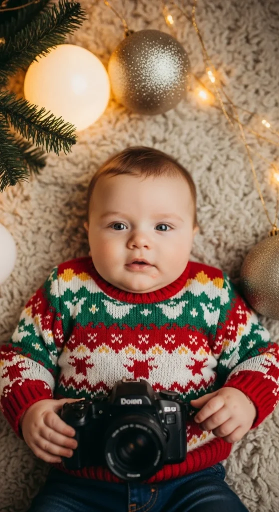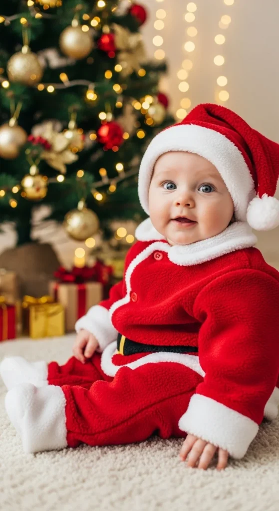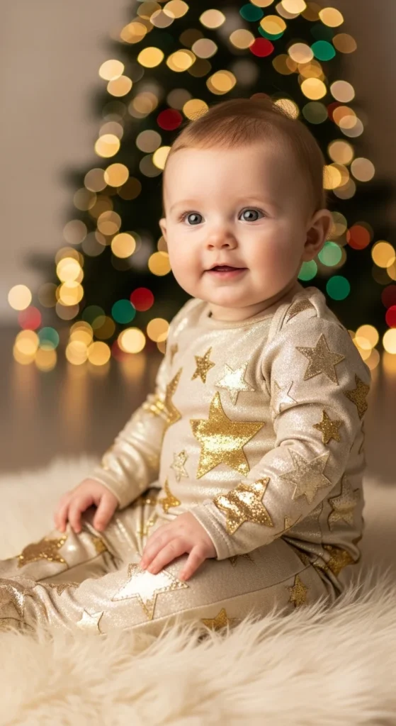 A holiday sweater look works well. Choose gentle knits. Pair with soft pants. Add a cute hat. Parents can photograph near ornaments. For budget ideas, thrift small sweaters. Wash gently. Fun patterns add visual charm.