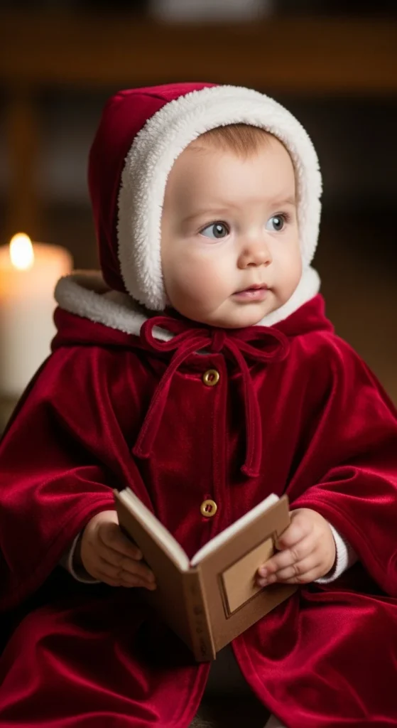 A baby caroler outfit fits music lovers. Use a soft velvet top. Add a tiny felt book. Keep it light. Parents can use warm candle-style lighting for photos. Pair with dark leggings and cozy socks. For budget ideas, print mini sheet music to place nearby. Warm tones make pictures glow.