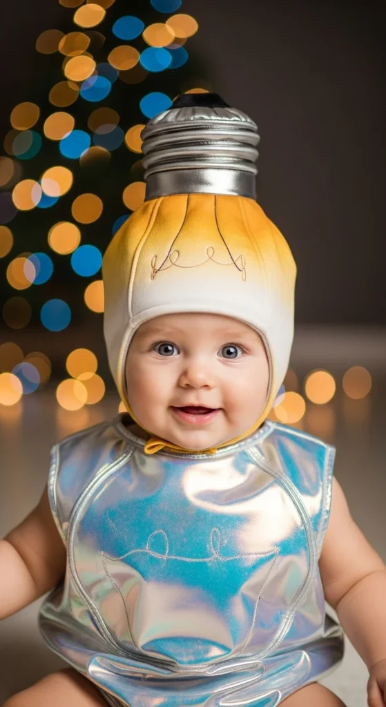 A light bulb costume glows in photos. Use a bright vest in red, green, or yellow. Add a silver felt band at the bottom to mimic the bulb connector. For the hat, cut shiny fabric and stitch lightly. Parents can place baby near twinkle light decor for warm sparkle. Skip real lights for safety. Add black leggings to match the bulb base. Take photos from above for a fun view. For budget help, cut strips of gift ribbon to frame the vest. Shiny fabric helps the theme stand out.