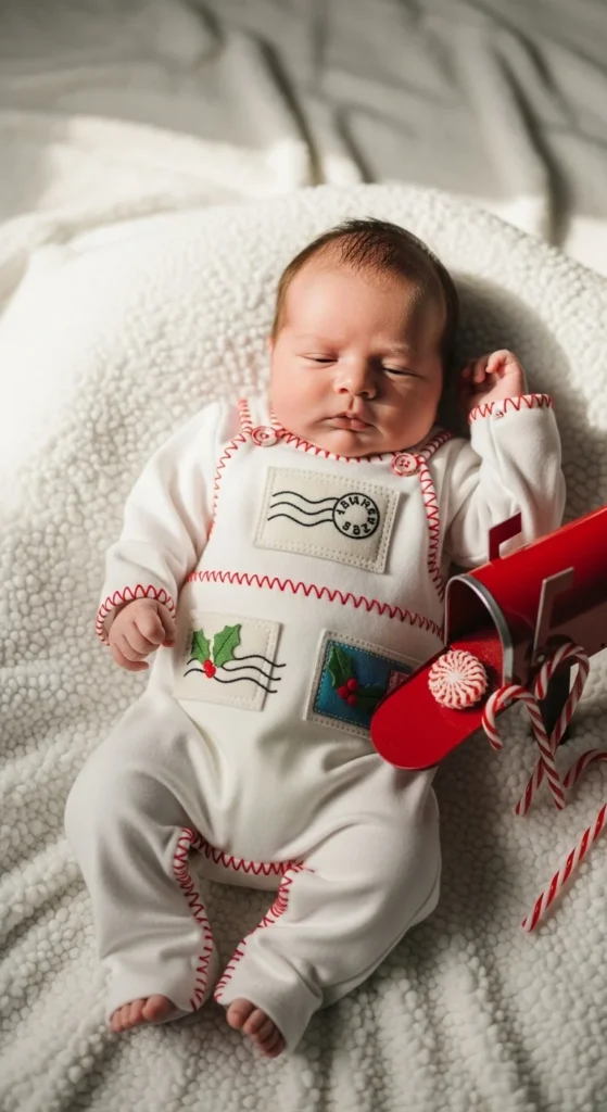 A postcard costume feels playful. Use a white onesie as the base. Cut red felt strips to make borders. Add a small felt stamp on the shoulder for fun detail. Parents can place baby near a small mailbox prop. For extra charm, add a tiny felt envelope patch on the belly. Light cotton layers keep baby comfortable. Take photos near candy cane decor for stronger theme support. For budget planning, use leftover mailing labels as harmless props near the scene. Border lines help the postcard style show clearly.