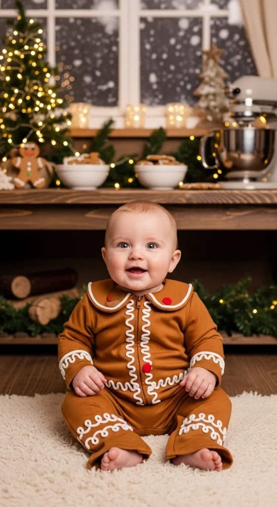 A gingerbread baby costume brings bakery charm. Use a brown onesie as the base. Add white squiggle lines with fabric paint. Let it dry fully. Parents can add small felt candy buttons. Use Velcro to attach them. Add a soft hat to match. For photos, place baby near cookie tins. If the room is cool, toss on a thin cotton layer under the suit.