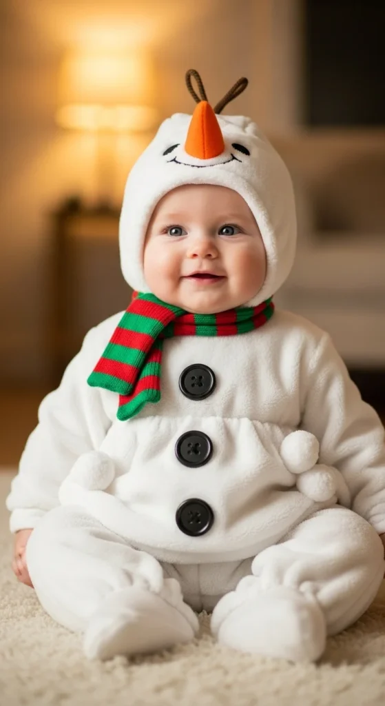 A snowman baby costume brings winter magic. Use a white onesie. Add black felt circles as buttons. Pair with white leggings. For a carrot nose, try soft felt attached to a headband. Skip face paint if skin is sensitive. Add a colorful scarf. Keep it light enough to remove fast. Use white socks for feet. For photos, create a snowy pillow scene. This works with limited supplies. Bold colors for the scarf help the outfit pop.