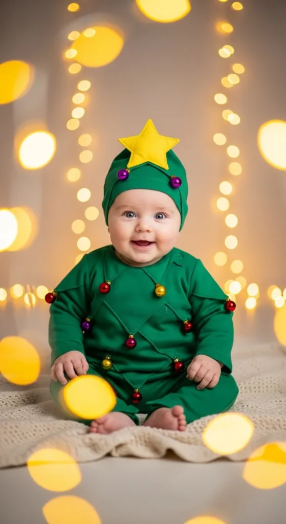 A baby Christmas tree costume brings joy. Use a green onesie. Sew or glue small felt ornaments. Add a star headband. Keep ornaments soft. Place baby near lights for a glowing backdrop. Use green socks for matching feet. For warmth, add cotton layers underneath. Parents can attach felt garland strips. This idea photographs well. For budget tips, use scrap felt and thread. Bright accents make the tree theme clear.