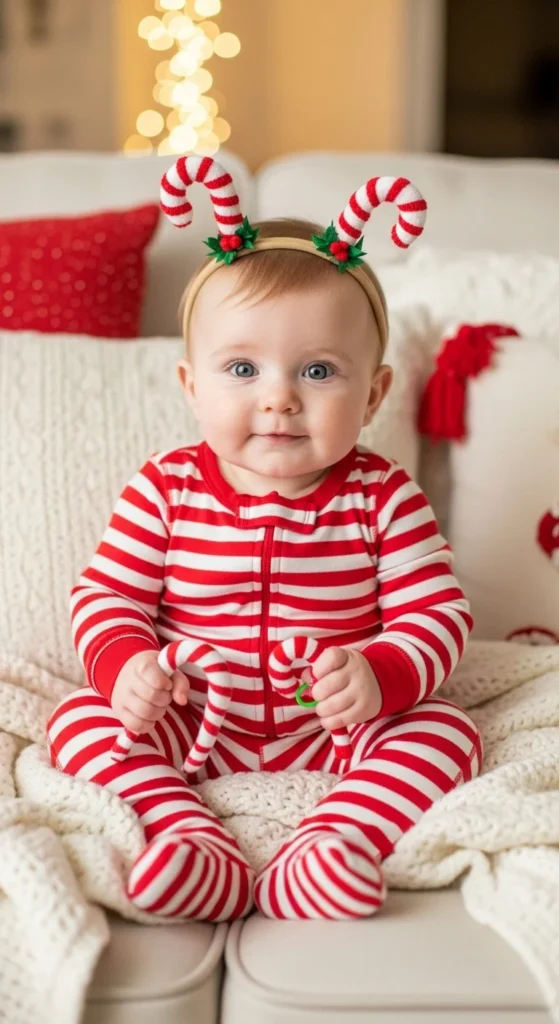 A baby candy cane costume is easy and cute. Use red and white stripes. Add a small candy cane prop made from plush fabric. Keep edges soft. Pair with red socks. For photos, place baby near wrapped treats. Use warm lighting to highlight stripes. For extra detail, add a small bow headband. This idea stays affordable because clothing often exists at home. Simple stripes send a clear holiday theme.