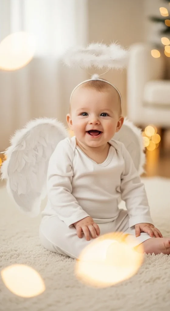 A baby angel costume looks peaceful. Use a white onesie and attach feather wings. Make a simple halo with a soft headband and gold pipe cleaner. Keep wings lightweight. For warmth, layer cotton underneath. Add soft white socks. This design works well for family pictures. Place baby on a white blanket to match. For budget tips, skip feathers and use felt. Light textures help keep the look gentle.