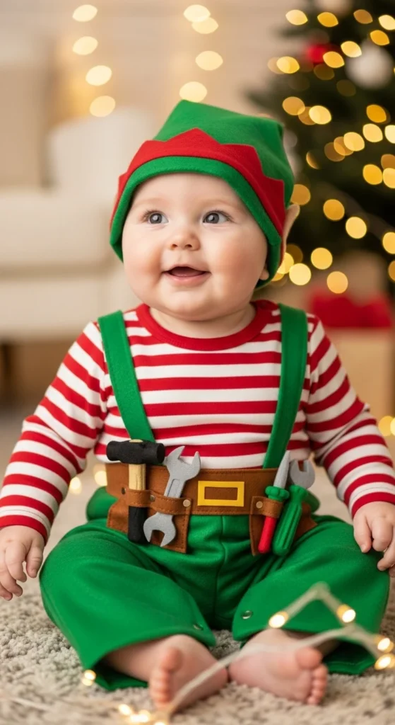 A baby elf helper costume looks playful. Use a green onesie with striped pants. Add felt pockets and tiny pretend tools. Skip small parts that detach. Add a cap with a small bell. Keep length short for comfort. Parents can photograph baby near toy workshop props. For budget, use cardboard tools instead. Color pops make the scene fun.